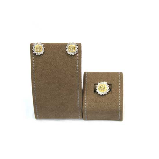 This delicate ring and earring set features a delicate floral design. The ring and earrings spotlight finely cut yellow diamonds encircled by tiny white diamonds. The fine jewelry set is a great gift choice for any lady.