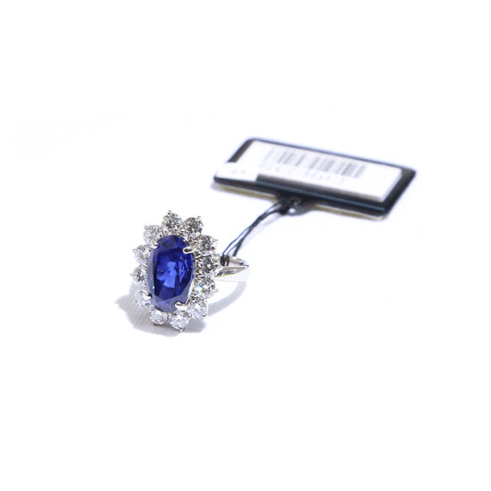 Displayed is a finger ring finely made from a sapphire and diamonds. The ring is cut into an oval shape for additional sparkle. The floral shape adds a feminine touch to your overall outfit.