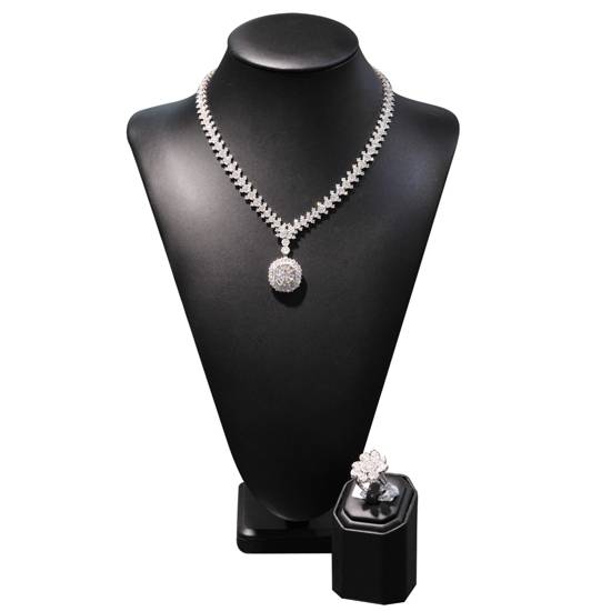 Featured is a diamond jewellery set with 18K white gold. It includes a necklace and a ring in botanical design. The diamonds are mounted in bead setting and prong setting.