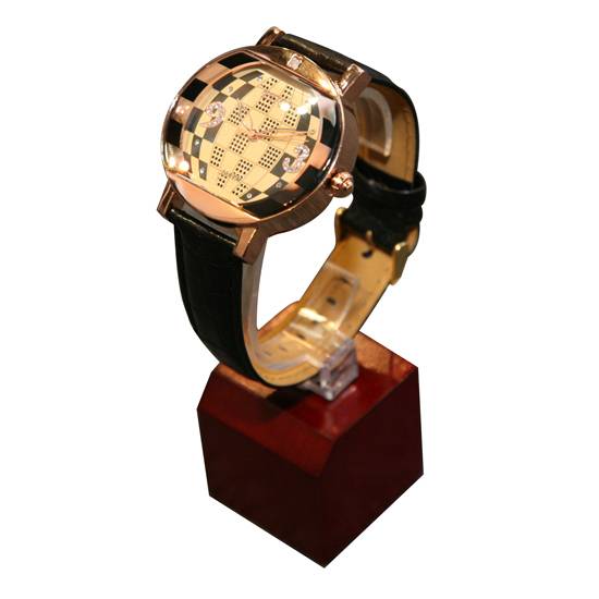 This is a men's diamond watch which is made of 1 pieces of 2mm diamond and 20 pieces of 1mm diamond. The watch is made with decorative ceramic watch dial and plated with golden metal watch casing.