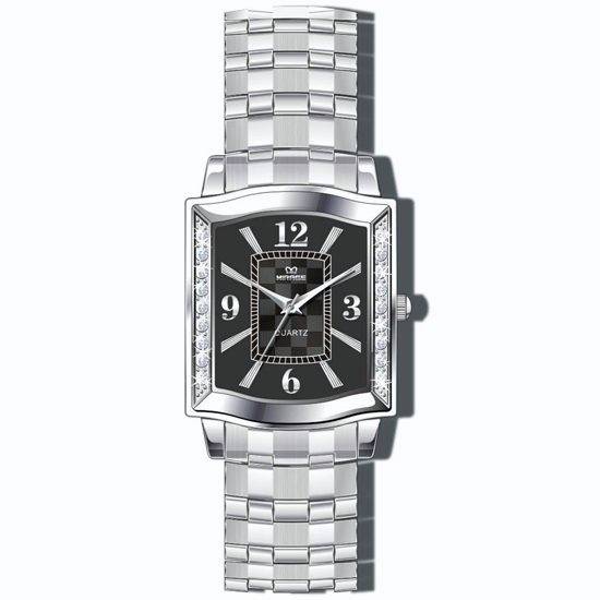 The sleek-design wristwatch touts a stainless steel case and band, promising prolonged durability with resistance to corrosion. The distorted rectangular-shape dial in black conveys a mysterious feeling. The prominent hour markings along with the hands in contrasting color offer accurate time reading. With sparkling diamonds affixed, this well-functioned watch makes an exceptional everyday accessory.