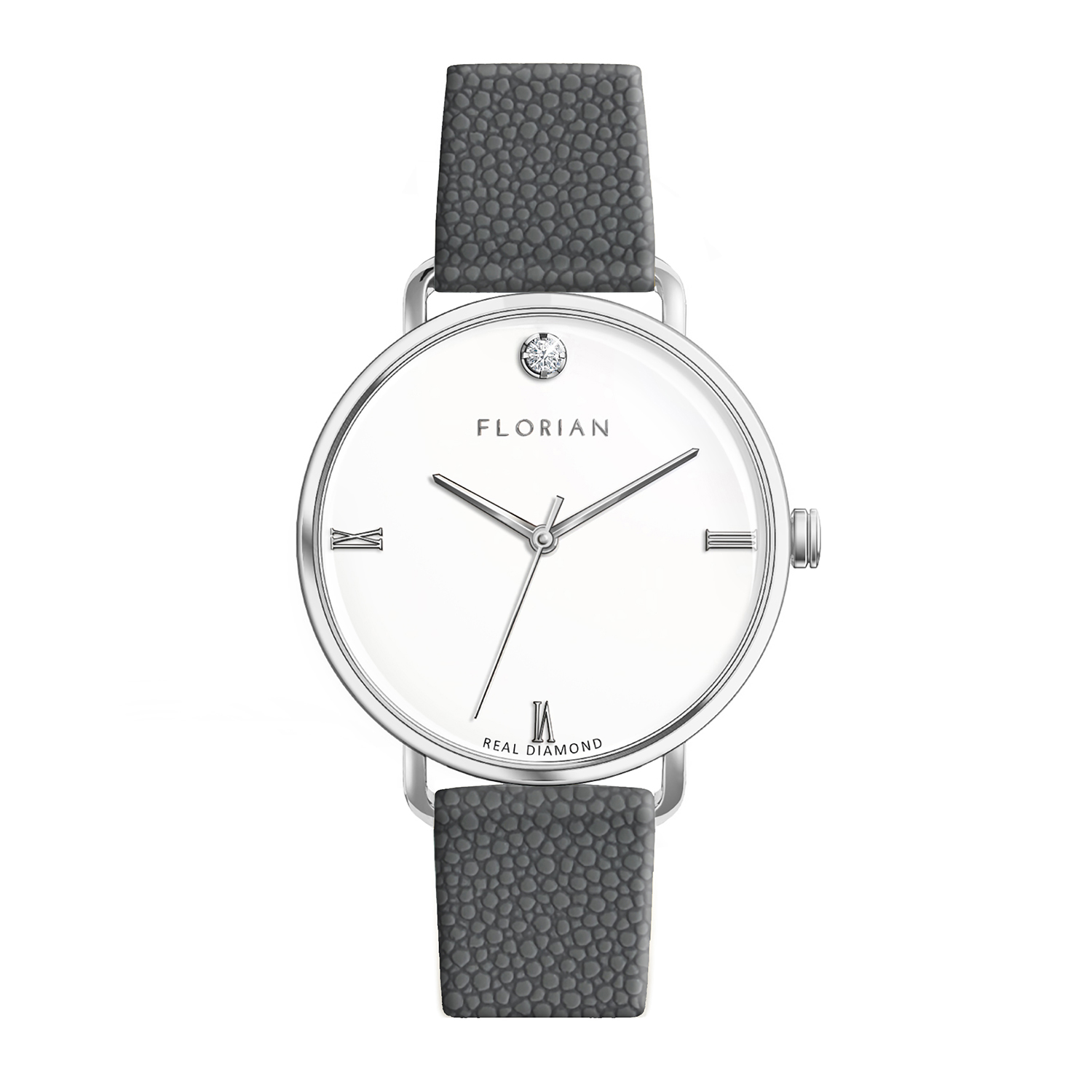 - Marks the time through a studded diamond and Roman indices.