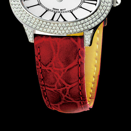 Fine leathery texture with stitched details gives this ladies’ jewelry wristwatch luxurious contrast to its channeled diamond bezel. Combining elegant exuberance with practical time display, its sleek and slender Roman-numeral hour markers exudes its unique feminine glamor.