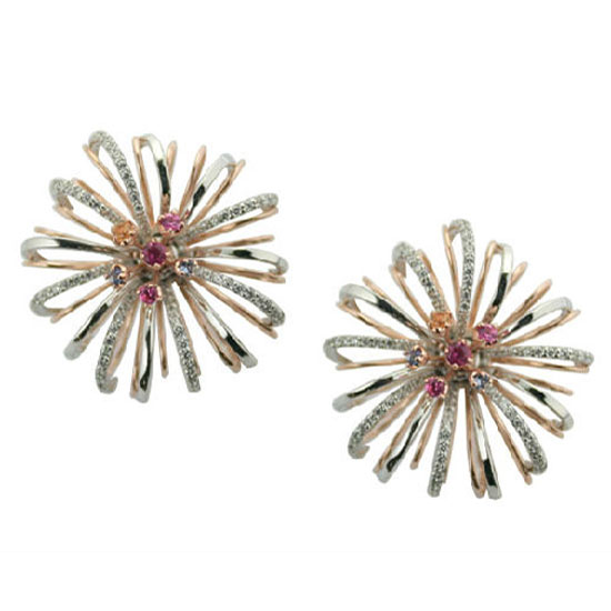Presented here is a pair of fancy earrings design in the shape of blooming flowers. Brightly colored stones and rubies express a touch of spring. Diamonds on the petals give this jewelry an extravagant style.