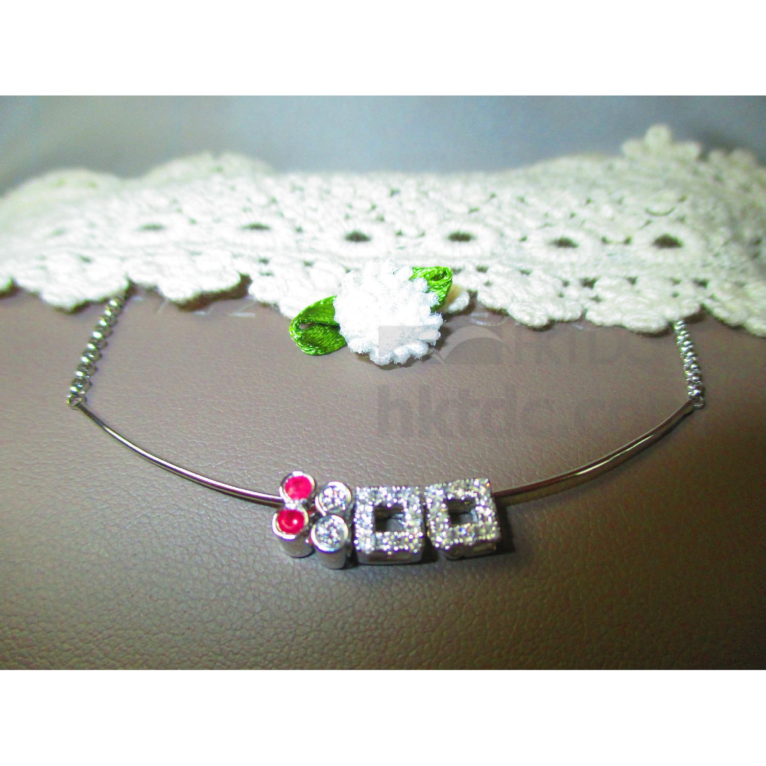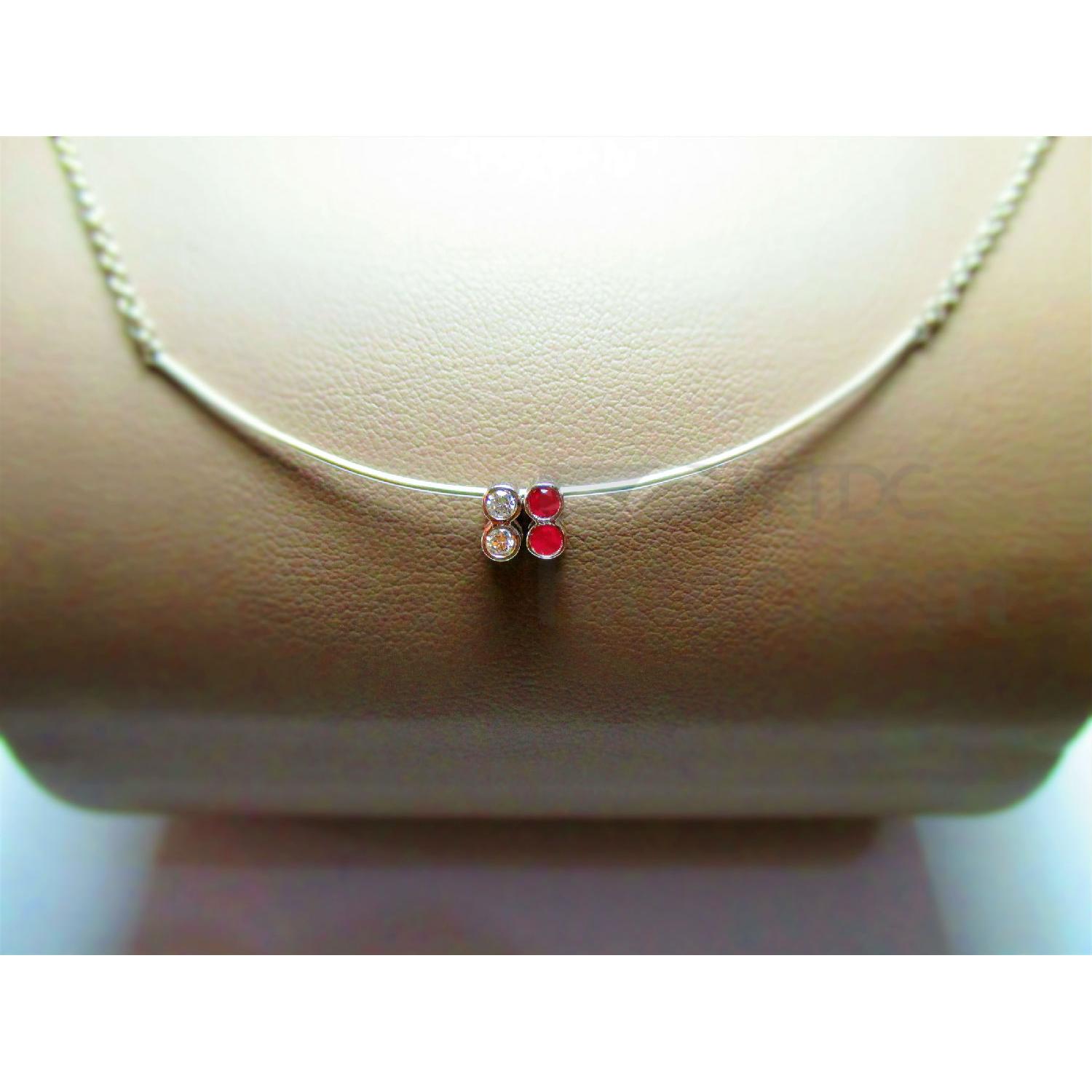Designed with an 8 shape, this double-sided pendant is set with two round-cut diamonds on one side and two round-shaped rubies on another side for versatile styling. It looks great when worn on neck or wrist, providing an ideal piece for adding flair to your jewelry designs.