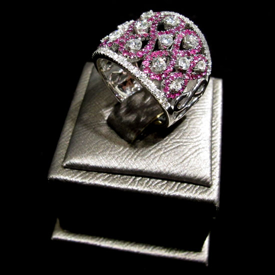 This diamond ring boasts a stylish and luxurious design. The quality diamonds are great matched with the pink sapphire for a unique feminine feeling. The brilliant handicraft makes this ring a fine piece of accessory for the fashionable ladies.