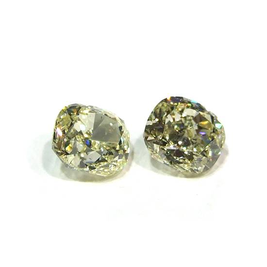This is a pair of cushion-shaped diamonds. Their faceted surfaces allow them to reflect the maximal amount of lights, which help create the sparkling image shown. They become colourful when they reflect coloured lights. Such an amazing diamond can be used for making various types of jewellery, including pendants and necklaces.