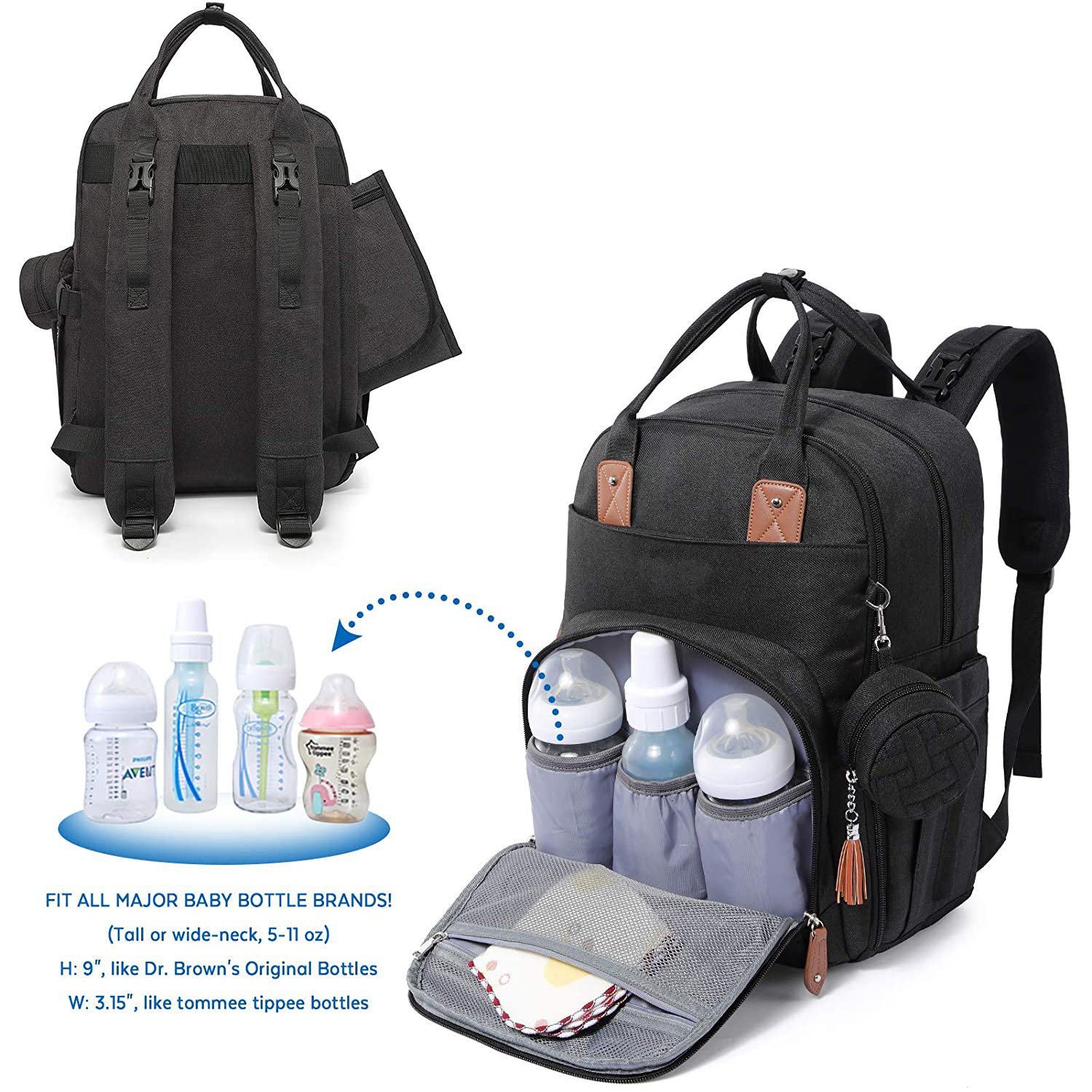 All-in-One Design: A large capacity diaper backpack (size: 16.5'' x 8'' x 12'') with a portable changing pad, stroller straps, a pacifier case, a zipper wipe pocket, a key loop, and 5 insulated pockets. Lots of pockets (2 big compartments and 18 pockets) in all the right places. It’s a cinch to pack, grab and go.