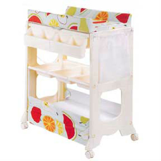 Showcased is a changing platform coming with a comfy padded changing mattress. The platform is concealed with a bathtub with a practical drainage tube. The storage trays underneath keep towel, nappies and other baby stuff tidily. Handy storage bag. Lockable casters. Colorful patterns.