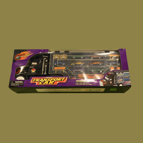 This set of toy cars includes 8 small cars and a large car transport trailer. The cars are made of die-cast metal and come with plastic parts. The car transport trailer can be used to store the smaller cars. This toy car set come in a scale of 1:22 and is suitable for kids aged 3 or above.