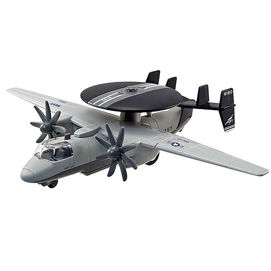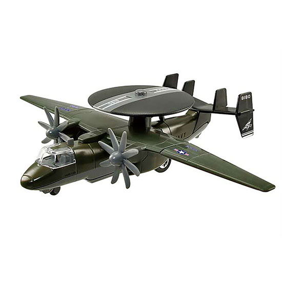 Kids will love this realistic die cast radar plane with pull back action for moving. It has two run-and-spin propellers, foldable wings and has a rotatable radar. This radar plane has pilot voice and propeller sound effects and is equipped with flashing lights on the cockpit and radar.