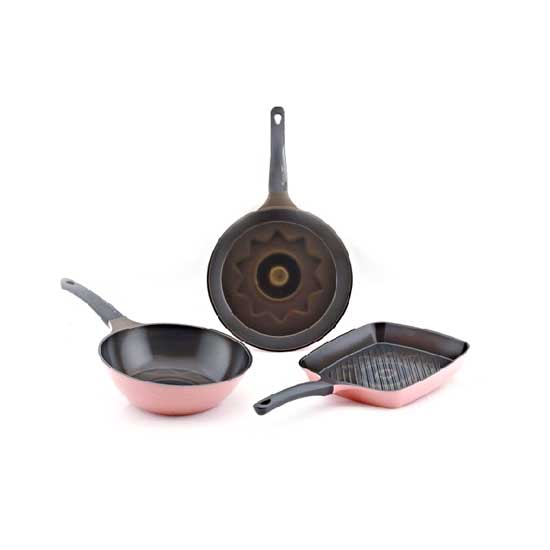 This is a series of frying pans that is made with a non-stick interior for easy cleaning. The entire piece is made of quality aluminum to give excellent heat distribution. This frying pan series is ideal for frying steaks and sausages.