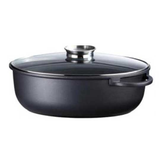 Displayed is a die-casting roaster with non-stick coating. The high-quality aluminum construction ensures years of guaranteed use. This fine roaster is an ideal addition for kitchens.