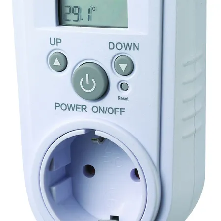 • Plug-In design for easy installation. - Red LED indicates Power On and Green LED indicates Heater / Air Conditioner On. - Replaceable 3VDC Li battery for back up battery power reserve more than 100 hours.