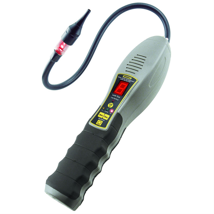 Proprietary sensor with lifetime of more than 300 hours of operation (ten years of normal use) Detects all commercially available HFC, HFO, HC, HCFC and CFC refrigerants as well as blends and newly approved replacements such as R-22 and R-1234yf Triple-redundant leak indication (loud fast beep, bright flashing LED, digital leak size reading) True mechanical pump draws in samples, increasing sensitivity Three sensitivity levels Fast warmup Comfortable neoprene grip Automatic calibration and reset to ambient levels Mutable beeper Garage-durable construction Made in U.S.A. SAE J2791 and J2913 certified Complies with European standard EN 14624 CE, RoHS, WEEE approved