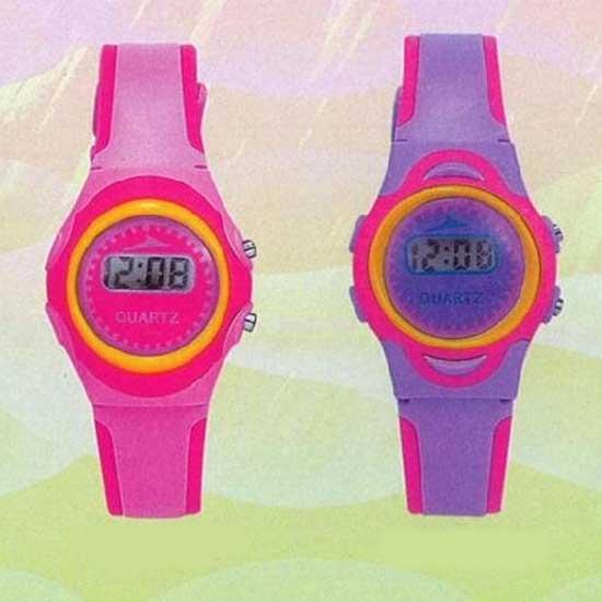 This eye-catching digital watch features a brightly colored plastic band and a round casing. The LCD display clearly shows current time in large, easy-to-read numbers. The high-quality digital watch grantees precise time keeping.