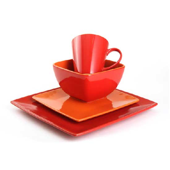 This ceramic dinner set includes two plates, a bowl and a cup. The dinner set features a glossy red finish. It will definitely brighten up your dinner setting.