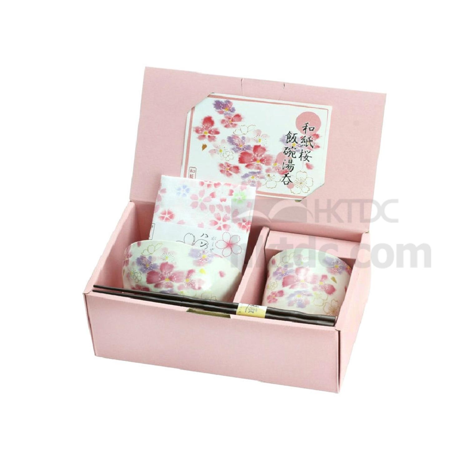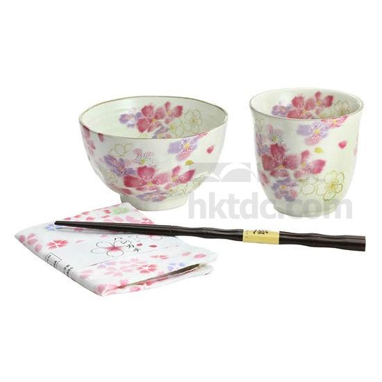 A captivating set to refine your authentic Japanese dining experience, this dinnerware set comes with a cherry blossom theme in pink. Designed for serving a proper meal for a single person with rice and tea or soup, this comprehensive set features a rice bowl, a cup, a pair of chopstick and a handkerchief well packaged in a gift box.