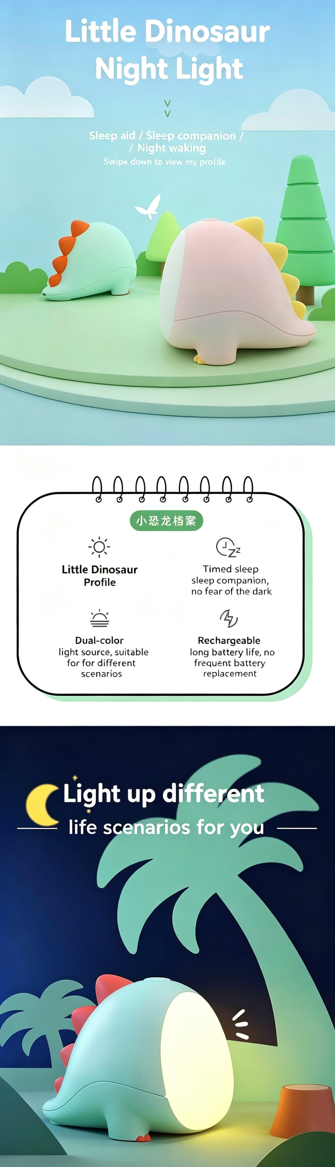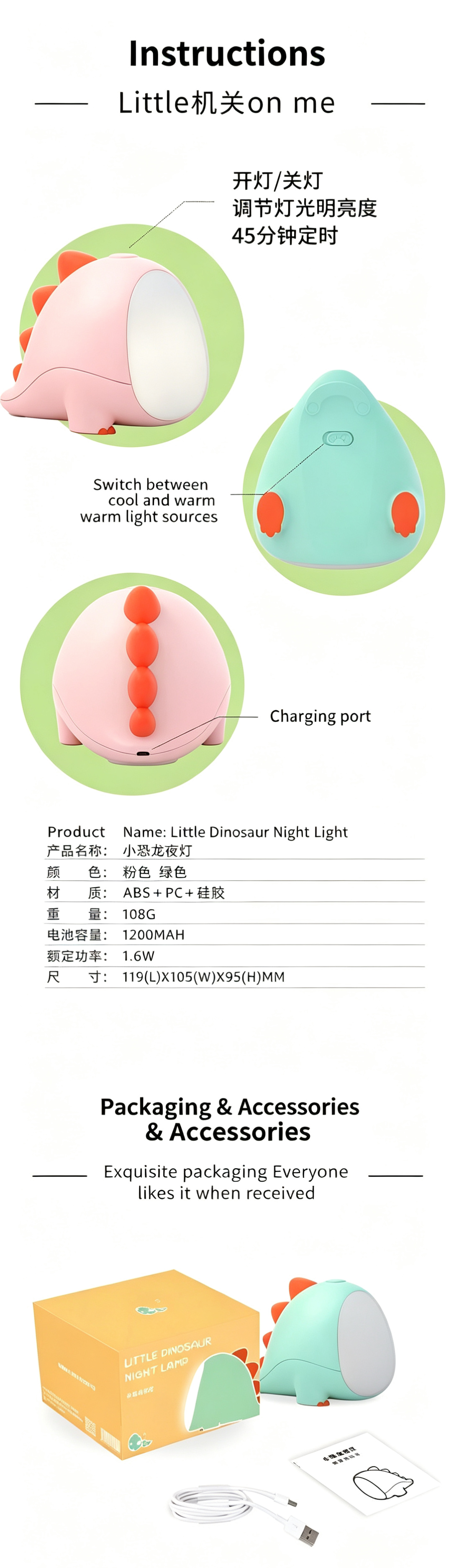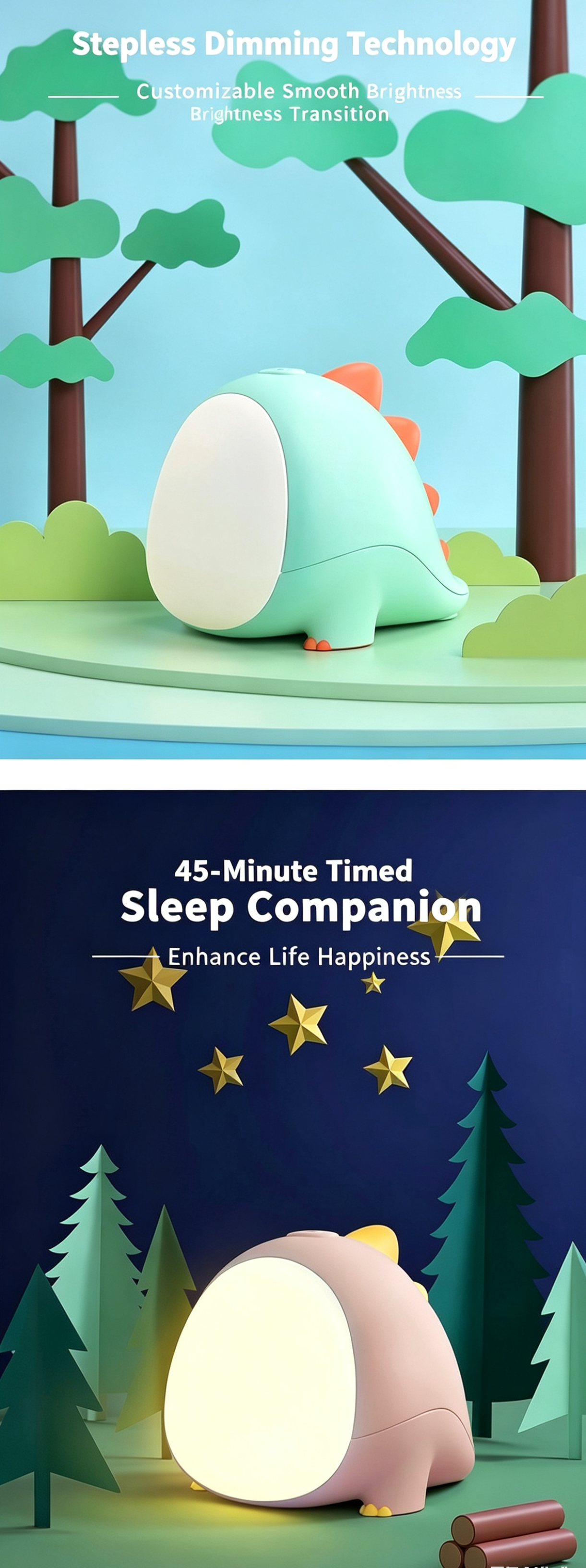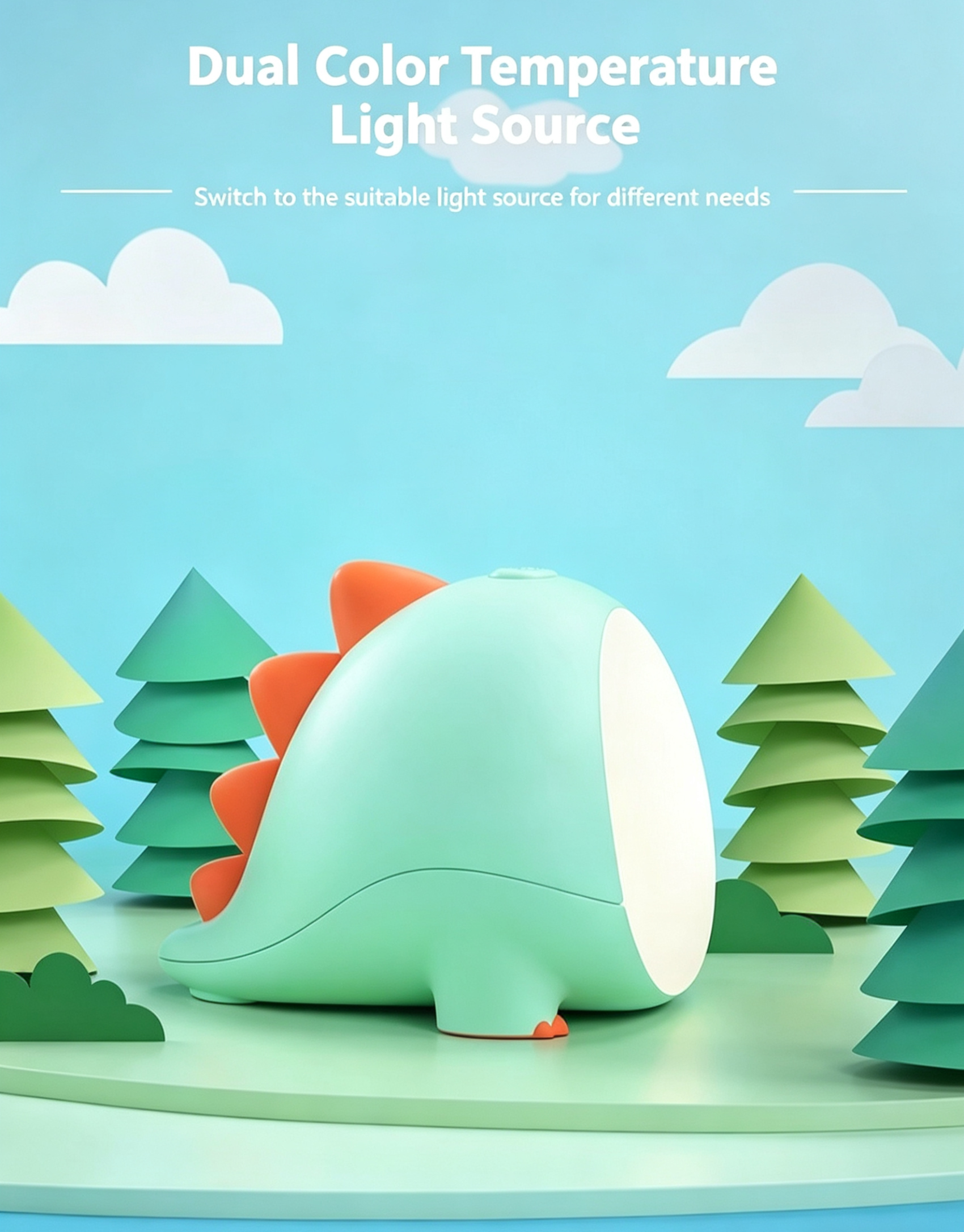 This adorable little dinosaur night light is a must-have for nurseries! It features stepless dimming, dual warm/cool light, and a 45-minute auto-off timer, creating a gentle, eye-friendly glow perfect for night feeds, bedtime, and kids' rooms. Made from safe, durable materials with a rechargeable battery, it’s portable, cordless, and ideal for newborns and toddlers. A cute, practical gift for baby showers and birthdays.