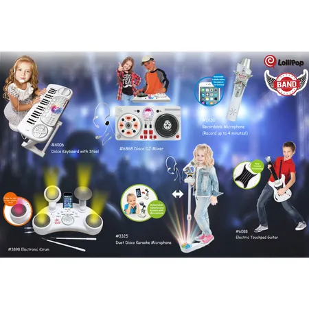 - 4 Drum pads with 12 drum sounds selectable (3 Modes: Drum / Bongo Drum / Electric Guitar);