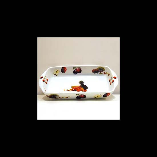 The dish is designed with random fruit pattern and is suitable to be placed in the oven