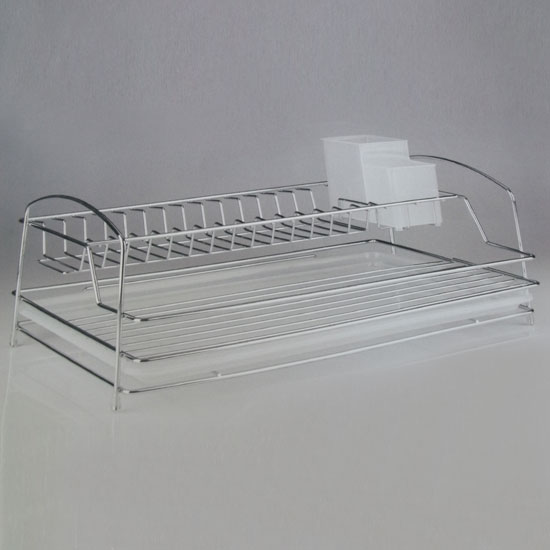 This two-tier dish drainer quickly dries dishes, bowls and cups after they have been washed. It comes with a small storage box for keeping chopsticks, forks, knives, etc. The chrome plated dish drainer is stylish enough to leave on the counter or in the sink.
