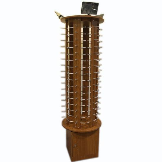 This cylinder-shaped display unit features a rotary display stand for easy access. The hangers can accommodate up to 96 pairs of glasses, allowing you to display your commodities in an organized manner. This display unit will make your eyewear products stand out prominently.