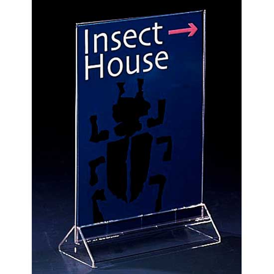 This leaflet stand features a transparent, double-sided design for omni-directional display. You can fit your leaflet or poster of A5 size between the panels easily. Its triangular base allows it to stand on surfaces firmly.
