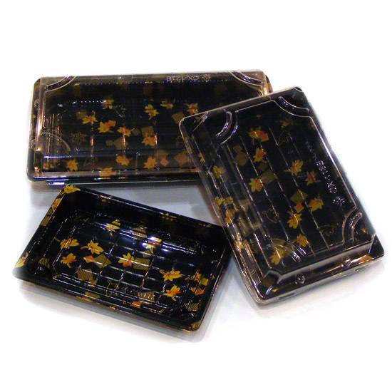 The featuring items are three disposable food trays especially for packaging sushi. Available in different sizes, they have a leaf pattern in yellow and black showing a Japanese style.