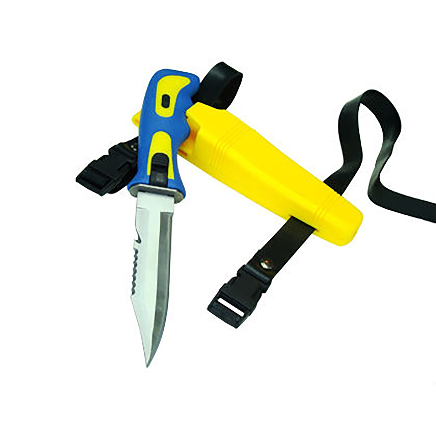 Stainless steel sharp tip scuba diving knife with non-slip handle including the following features: