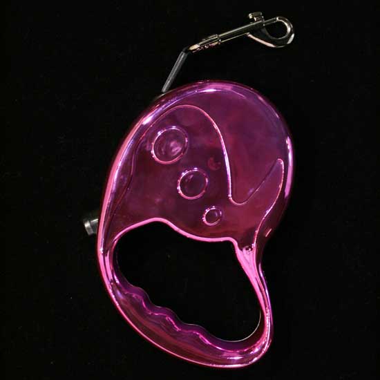 This dog lead features a holder in a metallic pink color. It allows automatic drawing back of the string to adjust the length of the string. The handle of the holder allows pet owners to hold the lead firmly.