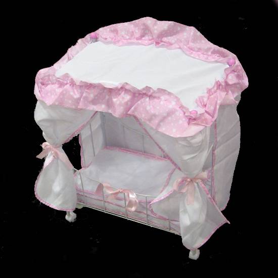 This is a doll bed for children to store their beloved dolls. It is white and pink in colour and has a princess or fairy themed design. It is also decorated with laced ribbons.