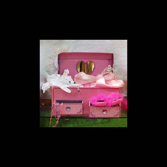 The doll dresses and accessories are placed in inside a pink box with drawers installed