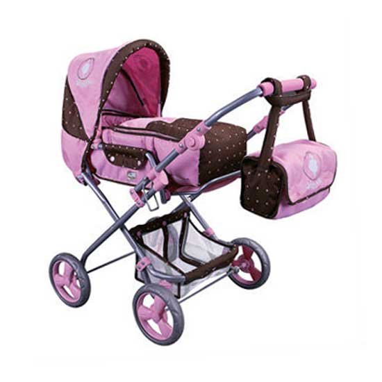 This attractive doll pram features a pinkish and dotted brown appearance for a cute accent. It also comes with a hanging bag of the same style for convenient carrying necessities. This vivid doll pram allows kids to take their dolls out easily.