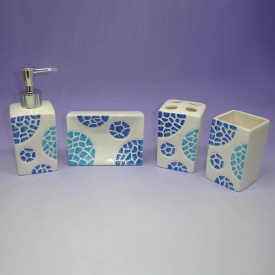 The elegant dolomite bathroom set comes with a lotion pump, tumbler, brush holder and soap dish. The gadgets are embellished with graceful blue mosaic patterns. This full set is excellent for integrity and matching. It is also a perfect option for home decoration and as a gift.