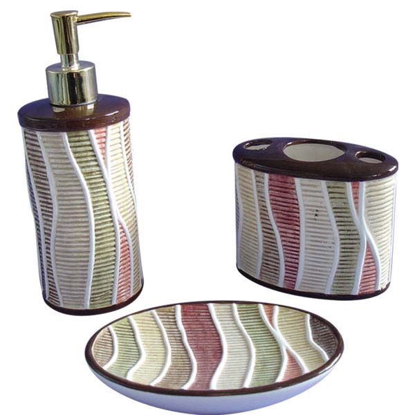 - Set of 3 dolomite bathroom set, include lotion pump, tumbler, brush holder, soap dish.