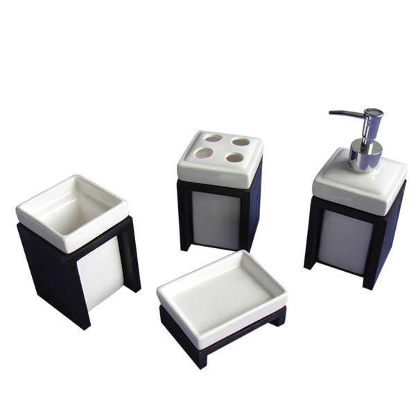 • Set of 4 dolomite bathroom set with black wooden holder, include lotion pump, tumbler, brush holder and soap dish.