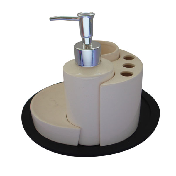 - Set of 4 dolomite bathroom set with black wooden holder, include lotion pump, tumbler, brush holder and moon soap dish.