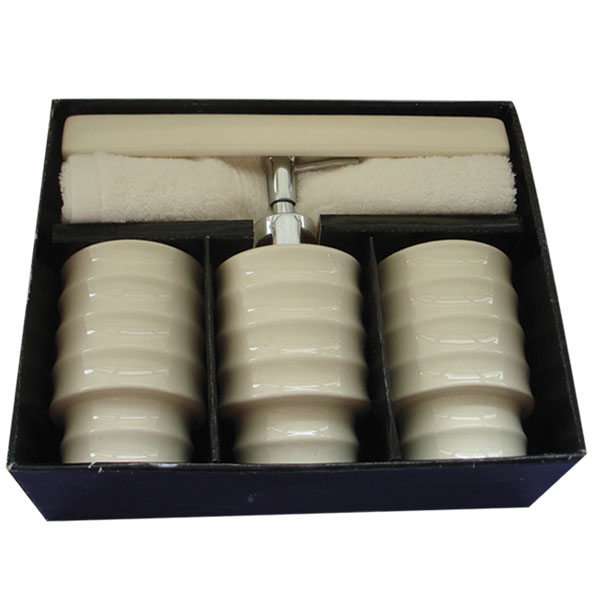 - Set of 4 dolomite bathroom set with black white towel, include lotion pump, tumbler, brush holder and soap dish.