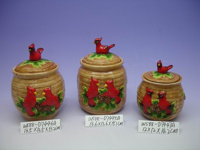 Dolomite sugar pot with parrot pattern with size in 12L x 12W x 14.2Hcm / 13.5L x 13.5W x 19.2Hcm / 13.6L x 13.6W x 19.7Hcm.
