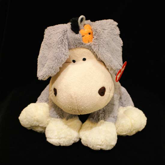 This cute plush toy is characterized by a donkey shape with a pair of big ears, hands and feet, making it look lovely. With a big head, this gray donkey looks so lovable that everyone wants to hug it. Embellished with an orange flower on its head, the donkey toy looks girlie. Give this nice donkey to your dear children.
