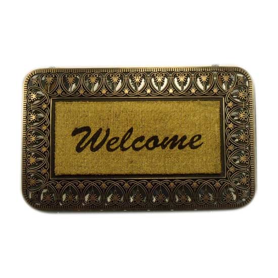 The door mat comes in a metallic tone. Boasting a rectangular style, it features a thick frame with rounded corners and a metallic finish. The frame flaunts a heart pattern in an antique style. The mat makes a welcoming furnishing item.