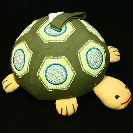 This door stopper features a lovely tortoise. The shell is stuffed with soft material and is decorated with hexagonal and circular elements. It makes a pragmatic and decorative household item.