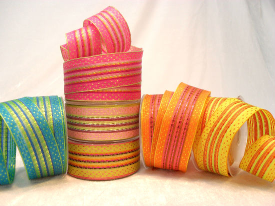 Colourful Dots & Stripes woven ribbons with wired edges, showing a vigorous and vivid look. Suitable for every occasion decorations or gift wrapping.
