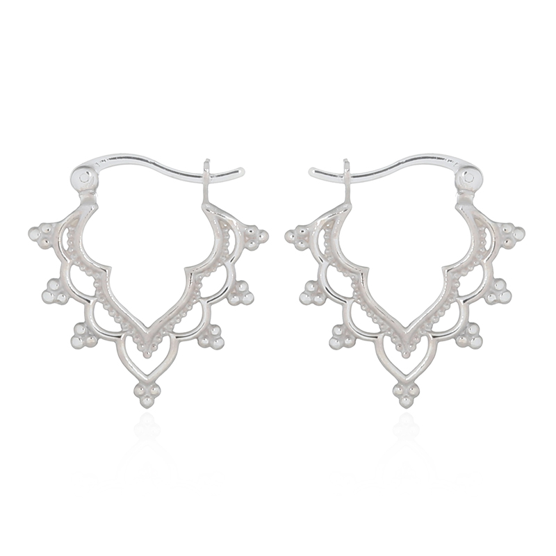 Bohemian 925 sterling silver earrings in the shape of a triangular flower with symmetrical silver ball clusters.