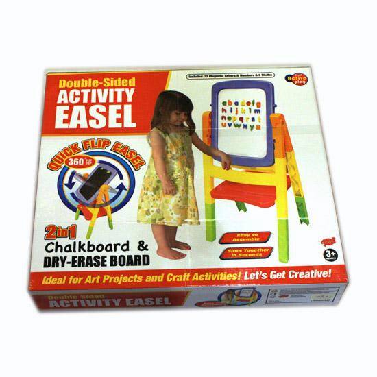 This is a 2-in-1 chalkboard and dry-erase board with the quick-flip function. It is easy to assemble and can be put together in seconds. This double-sided activity easel is ideal for art projects and craft activities.