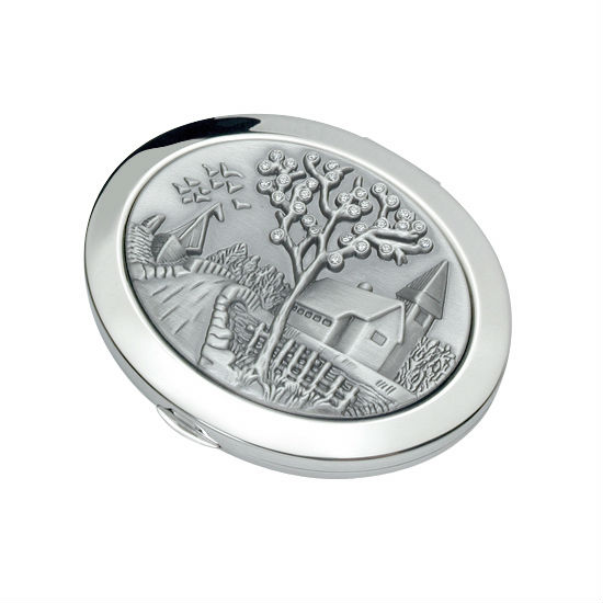 Shiny Nickel Plated with white crystals & engraving in Pewter Plated (the cover with a picture of a white crystal tree, house, path, junk & birds in the sky)