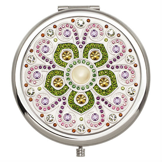 Round shape. Embossed floral patterned cover with enamel painted and color stones.