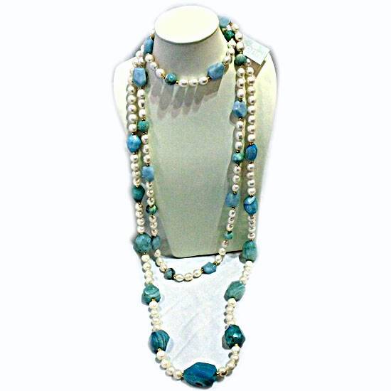 The long pearl necklace features a double-strand design. The genuine pearls are interspersed with gorgeous blue agates for a glamorous touch. Accessorize elegantly with this pearl necklace.