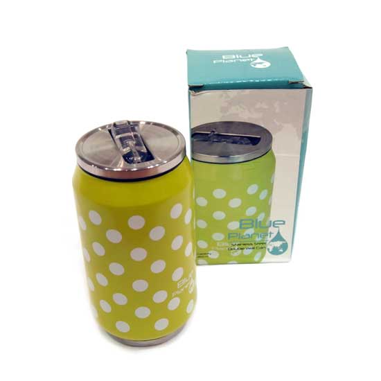 This alluring double-wall can features a greenish appearance with white polka dots. It is constructed from stainless steel for sturdiness and durability. This enticing double-wall can makes a great gift for friends.